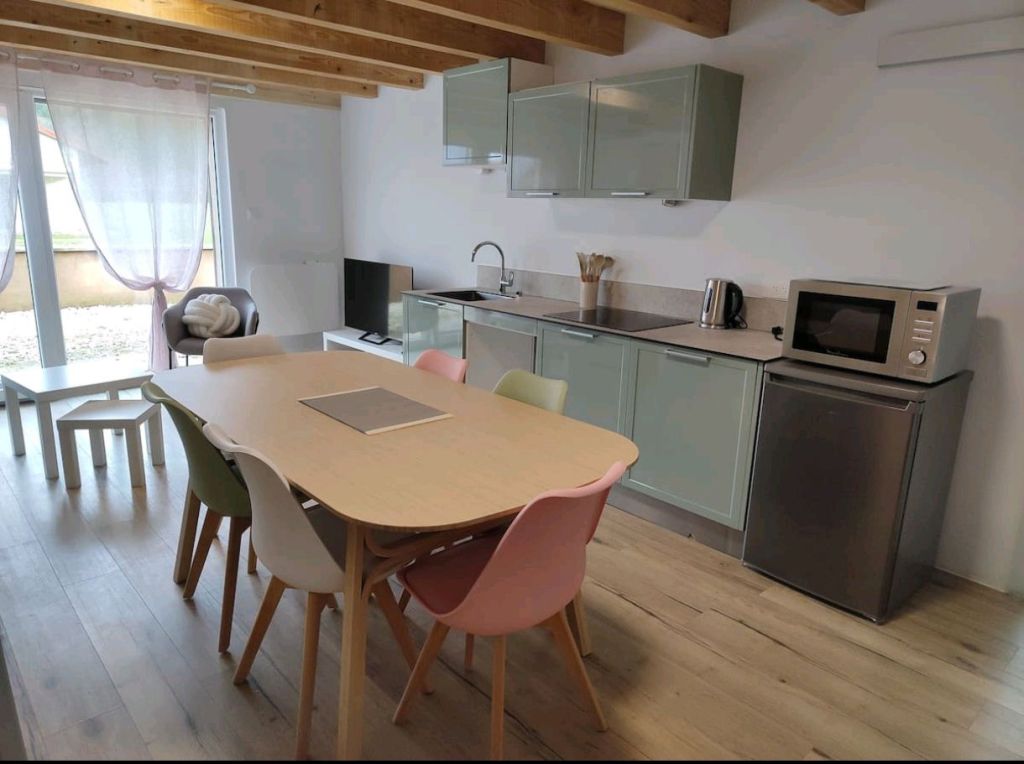Au rez de chaussée : cuisine équipée, table a manger et salon avec canapé lit de 140cm. Salle de bain privative. Smart TV et wifi.